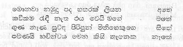 Lastly the Love Poetry occupies a significant place in Sinhala poetry. Apart from the Classical Poems referred to earlier in discussing the Ornate Poetry in later poems like the Viyovagaratnamalaya (the Gem Garland of verses of Separation). We have had a famous poetess called Gajaman Nona to whom many erotic verses are ascribed. One instance where an admirer gives advice to her and her reply to him is as follows;