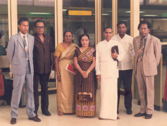 A delegation of Sinhala Poets leaves to China. (From left) K. B. A. Edmond, Sesiri Wijesekera, Ms. Nanda Hegoda (wife of late Wilson Hegoda), Hon. Mr. and Mrs. P. B. Kaviratne, Indrananda Abeysekera and Chitrananda Abeysekera