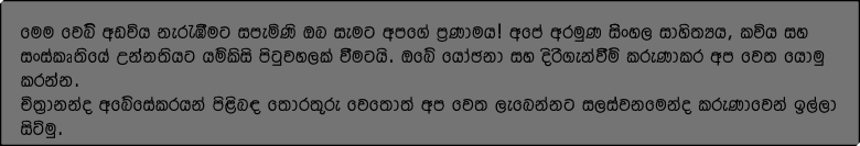 Thank you for visiting our web site. This is a non-profit and non-commercial institution. We are committed to uplift Sinhala Literature, Poetry and Culture. Our goal is to establish a fund to help the said cause. We do appreciate your comments, contributions and encouragement. Please do not hesitate to write to us. If you have any related information about Chitrananda Abeysekera, or any comments, please do forward those to us or contact us.